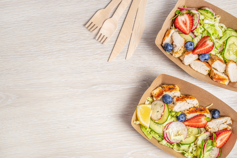 Then there are bowls. Bowls are great, and often you can get ones that are takeout style, made out of cardboard, or some kind of material that is environmentally friendly if you want, or you could use a plastic bowl with a lid. We like to use bowls made of sugarcane because they’re better for you than paper plates. You get great plates and bowls made from sugarcane. Once you have a bowl, look at the size, and decide what to put in it. Think of it like a takeout from your favorite restaurant. What would they do?